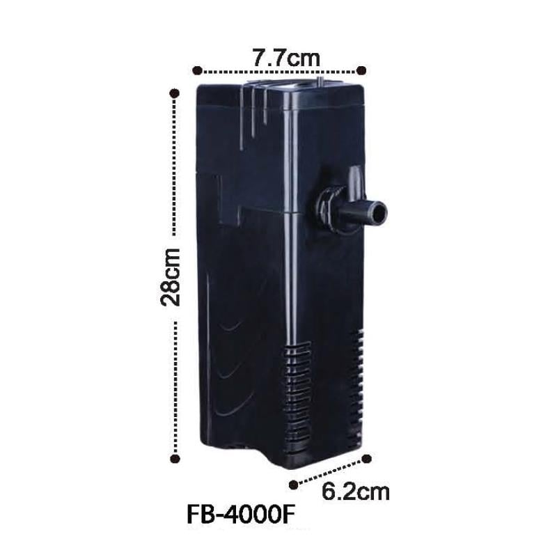 Dophin FB 4000F İç Filtre; Tatlı ve tuzlu su akvaryumlarda mekanik, biyolojik temizlik ve oksijen sağlayan, saatte 600 litre su filtreleme kapasiteli, 13 watt'lık iç filtredir. * Filtre içerisinde, filtre materyali olarak karbon ve sünger bulunmaktadır. * Kutu içerisinde hortum, fiskiye ve bağlantı aparatları bulunmaktadır. * Hareketli aparat sayesinde fiskiyenin yönü ayarlanabilir. * Ayarlanabilir çıkış ile hava kontrolü sağlanabilir. Kullanma Talimatı; Filtre arka bölümünde yer alan vantuzlar yardımı ile akvaryumun iç yüzeyine, tamamen su içerisinde kalacak şekilde yerleştirilerek kullanılır. Sadece hava hortumu su dışarısında kalmalıdır. Kutu içerisinde bulunan fiskiye aparatı ile de kullanılabilir. Filtrenin temizlenmesi ile su değişiminin aynı zamanda yapılması daha uygundur. Temizlik öncesi mutlaka fişten çekilmelidir. Kılıf kapağı açılarak içerisindeki sünger filtre ve karbon güçlü su akan musluk altında temizlenir. Filtre çıkarılarak düzenli aralıklarla temizlendiği taktirde filtre işlevini daha sağlıklı yapacaktır. Uyarılar; * Filtre sürekli çalışır durumda olmalıdır. Sadece temizlik için durdurulmalı ve temizliği kısa sürede yapılıp tekrar çalıştırılmalıdır. * Filtre akvaryum içerisine düştüğü taktirde yani vantuzları çıktığında fişi çekilmeden düzeltilmemelidir. Elektrik çarpmasına neden olabilir. * Fişi çekildikten sonra temizlik yapılması tavsiye edilir. * Filtrenin temizliği sadece su ile yapılmalı ve deterjan kullanılmamalıdır. * Filtrenin işlevini tam olarak yapabilmesi için filtresi sürekli kontrol edilerek temizlenmelidir. * Filtrenin elektrik kablosunun hasar görmemesine dikkat edilmelidir. * Filtre başka bir amaçla kullanılmamalıdır. Su dışında çalıştırılmamalıdır. Isı kaynaklarının yakınında muhafaza edilmemelidir.